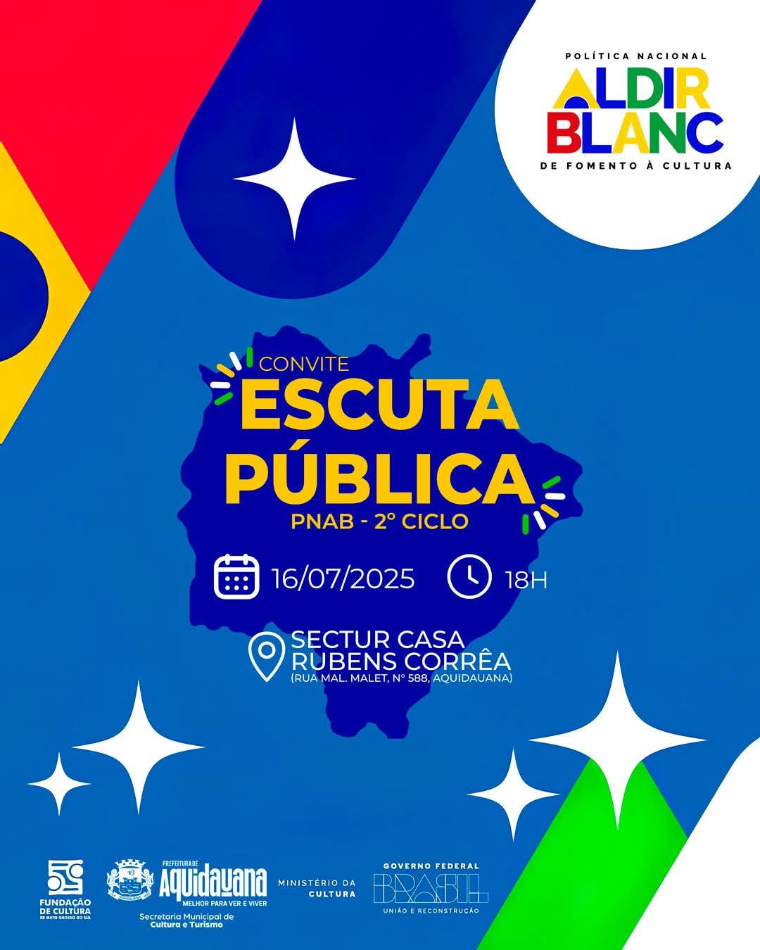 A Secretaria Municipal de Cultura e Turismo (SECTUR) convida todos os fazedores de cultura de Aquidauana para participarem da Escuta Pública referente ao 2º ciclo da Política Nacional Aldir Blanc (PNAB).